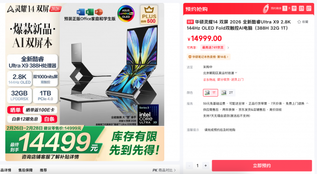 第三代英特尔酷睿Ultra X9 388H旗舰级移动处理器的高能表现,搭配一机双屏、五种形态全场景适配的交互革新,让华硕灵耀14 双屏 2026真正打破了移动办公的场景边界,对于追求高效办公、专业创作的商务精英与创意工作者而言,无疑是新年换机的优选。#京东重磅新品日#上京东搜索“华硕灵耀14 双屏 2026”即可了解更多产品细节,新品首发价14999元,京东Plus会员直降500元。