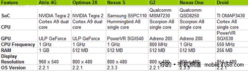 MOTO Atrix、LG Optimus 2X,还有三星的Galaxy S II,使用双核处理器的手机在2011年年初纷纷亮相,不过双核处理器的性能是不是真的像我们想象一样的凶悍呢?国外网站androidandme找来了几款在Android各时期都颇具代表性的机器进行了对比跑分测试,来看看吧: