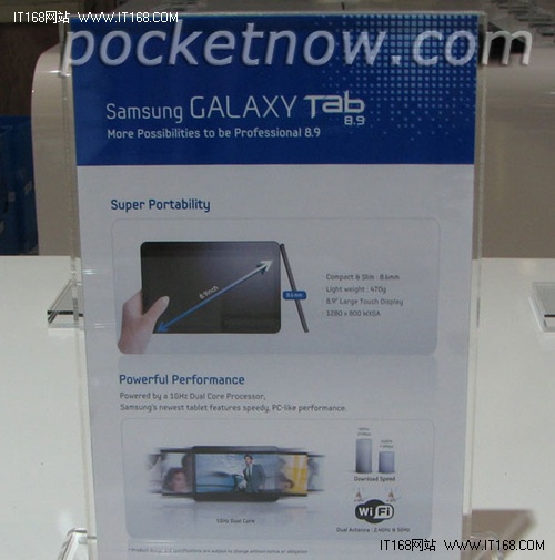 【IT168 资讯】算上Galaxy Tab和Galaxy Tab 10.1,三星已经是目前安卓阵营中拥有平板数量最多的主流厂商了,前不久三星还曾经放出过消息称将要发布一款8.9寸的平板产品,而在最近几天的CTIA展会上,我们就见到了这款新平板的规格展示。