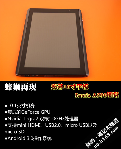 Acer Iconia Tab A500采用的是10.1英寸的屏幕,具备10点触控和陀螺仪的功能,而且背面为金属材质,质感非常优秀。