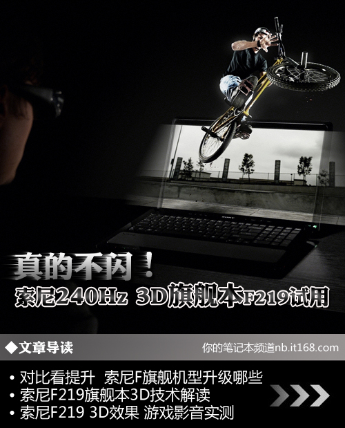 试用总结:240Hz的刷新率以及帧顺序法技术使得这款索尼F219展现出来的3D效果要强于普通的3D笔记本许多,LED背光控制技术的加入也解决了3D效果呈现时光线偏暗的情况,使得这款索尼F219笔记本的3D效果成为目前体验最为舒适的一款笔记本了。再加上强大的硬件支持,让这款笔记本不仅适合高清3D电影的播放,同时让许多3D游戏在高分辨率下也能够获得非常流畅清晰的体验效果,虽然这款笔记本19999元的价格偏高,但是对于游戏影音体验要求非常高的用户,在预算允许的情况下算得上是一个非常不错的选择。