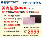 【IT168 行情】随着笔记本技术的进步,采用金属材质的本本,不仅能够拥有轻薄机身,更能成为商务人士和白领的非常好的工作助手。神舟精盾K360A-i3 D4外观上采用13.3吋铝合金顶盖,经典睿智的沉稳黑色与可爱俏皮的靓丽粉色,无法掩饰其超凡脱俗的气质!免费双升级的精盾K360A-i3 D4,采用第二代英特尔双核2.3G处理器2350M,拓展为500G硬盘存储空间。同时,搭载HM65芯片组,高速显存4G DDR3-1333以及无线网卡、DVDRW刻录光驱等完善的周边配置。现在,精盾K360A-i3 D4新升级后仅售2999元,为您全力打造高性能与高性价比的超豪华视听盛宴!