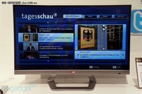 你可以通过LG自家设计的Smart Remote无线遥控器来操控这台智能电视,我们看到的样机里面内置了德国本土视频内容,包括2D和3D节目,下个月发售的时候会直接将这些内容内置其中,欧洲市场会同期上市。