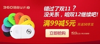 双12大促在即,你准备好你的钱包了吗?为了让更多人在寒假前把WiFi带回家,360随身WiFi将在12月11日~13日三天在京东商城展开满99减5的优惠促销,不仅如此,每个360随身WiFi还将赠送50个京