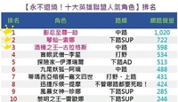 最受玩家喜爱角色的第一名就是影忍至尊——劫啦!靠着优秀的位移能力、强力的爆发伤害,在不少比赛中都是选手们的爱用角色,也因如此在一般游戏中许多中路玩家都喜欢使用这隻角色,第一名的殊荣可以说是当之无愧啦!