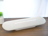 到手的第一感觉是要比想象中的要大一些的,外观上采用了长条椭圆形的设计,并且两侧的腰线设计从上至下是逐渐收窄。这样的设计很好的平衡了实用性与美感,扁平的造型放在电视下方也不会遮挡住电视内容,上宽下窄的造型又让大尺寸扬声器也能放在电视下也不会占据太多面积。