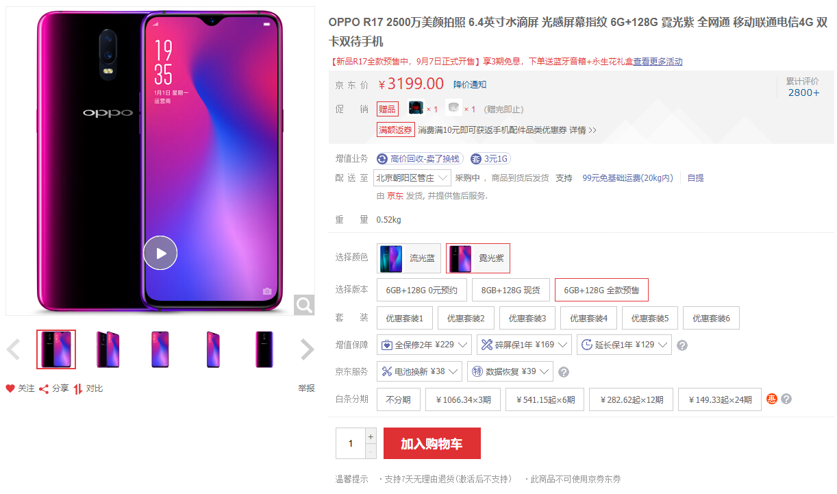 【IT168 什么值得买】只要你关注过手机行业的动态,那么我想你就已经被OPPO R17开售的消息刷屏过了,和之前的R系列一样,这款新机一经开售,线上下线的销量都非常火爆。根据最新的消息来看,R17这款新机仅用1小时就在京东获得了3000-4000元价位段的销售额和销量两个冠军,由此可见OPPO R17整机受用户喜爱的程度之高。近期京东的OPPO R17已经上架了起售价更低的6G+128G版本,售价为3199元。