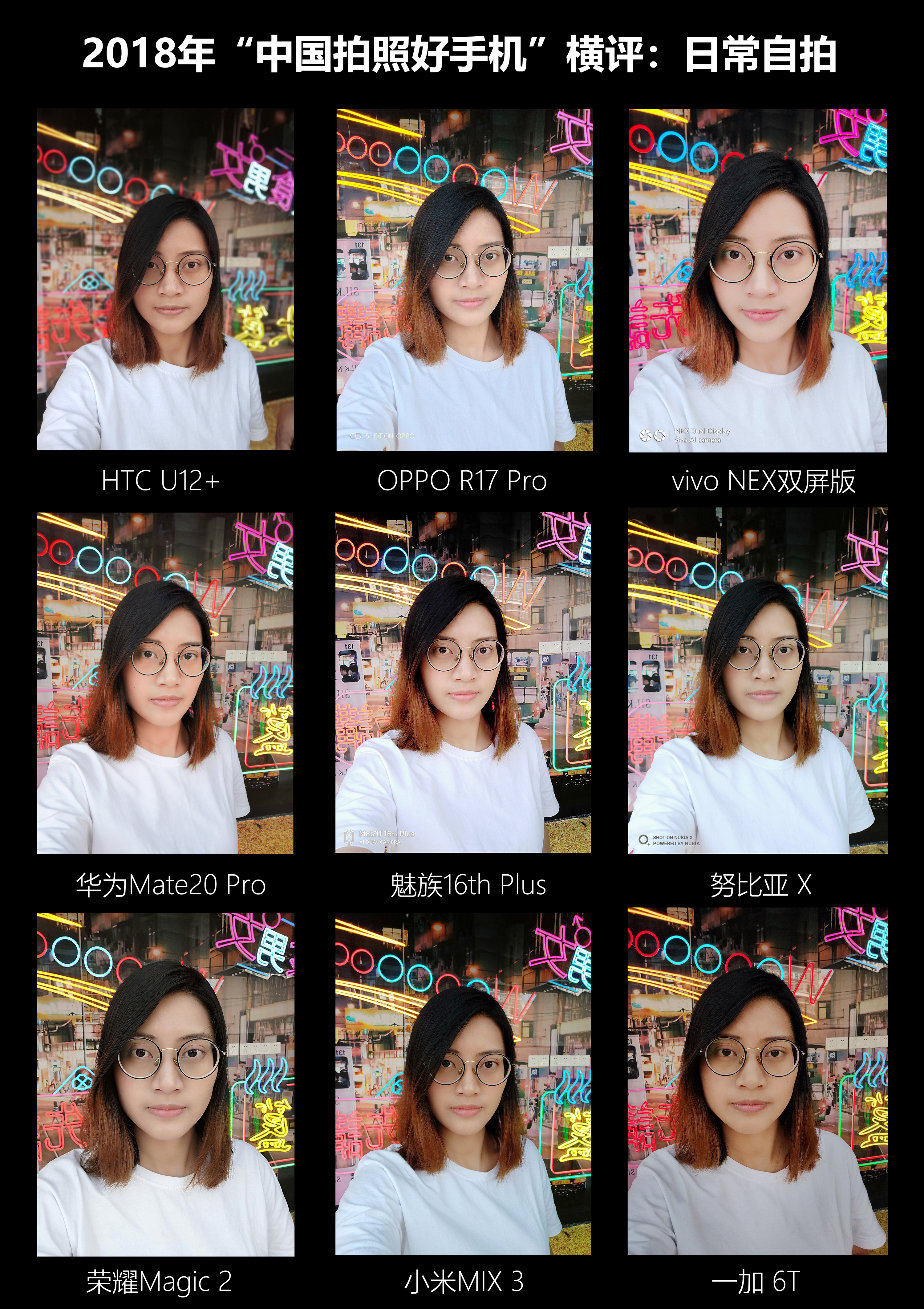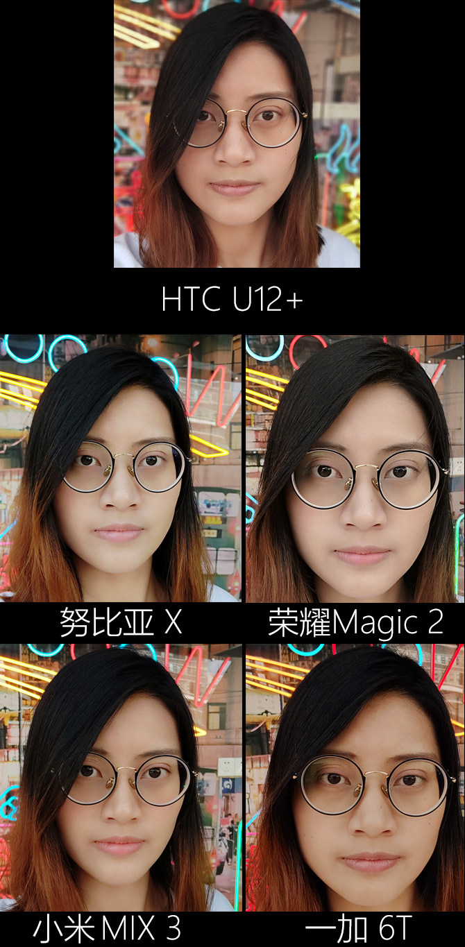 整体↓:HTC U12+(皮肤灰暗)、一加6T(皮肤灰暗)、努比亚 X(皮肤发青)、华为Mate 20(美颜不足)、荣耀Magic 2(美颜不足)、小米MIX 3(脸型变形)