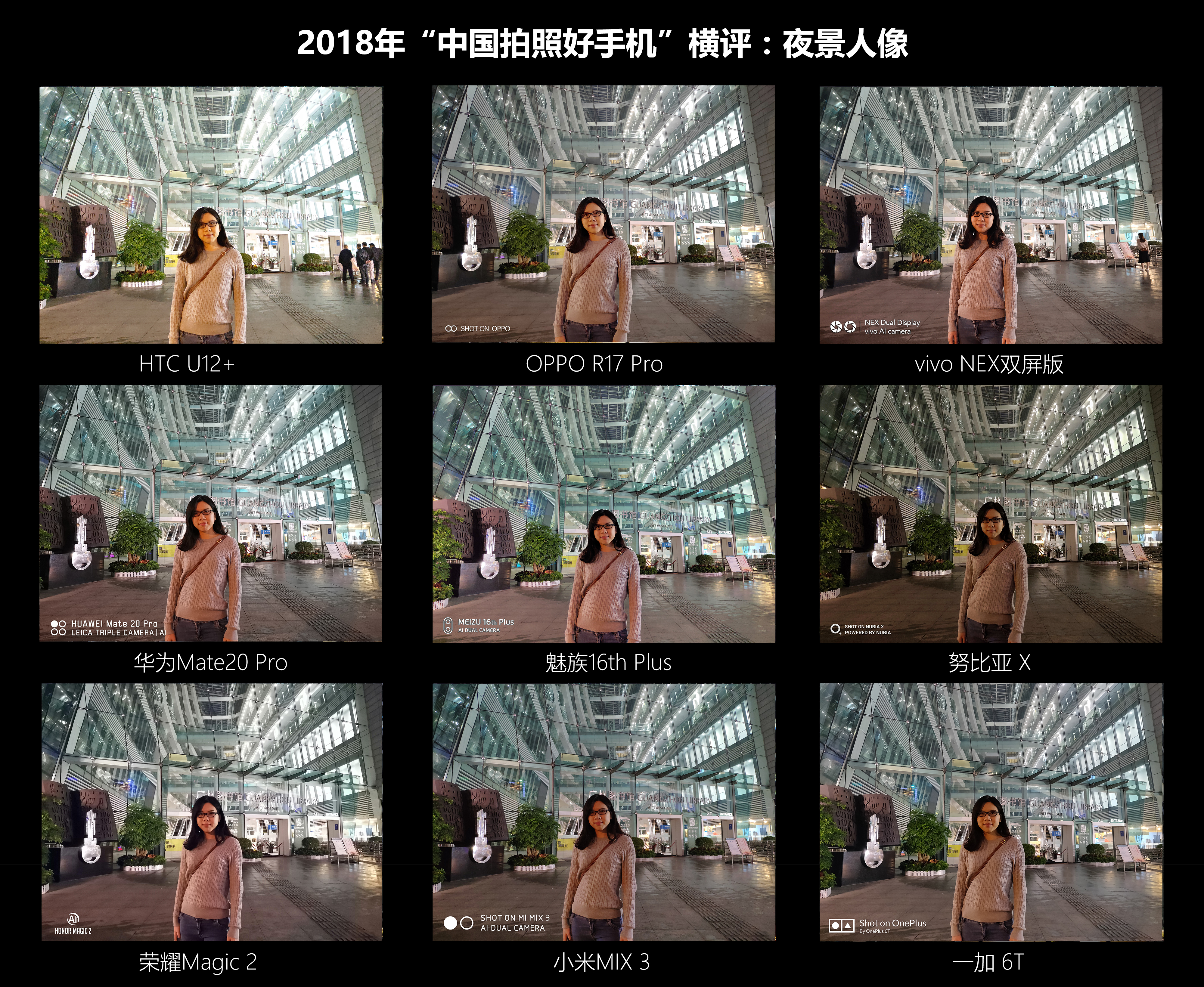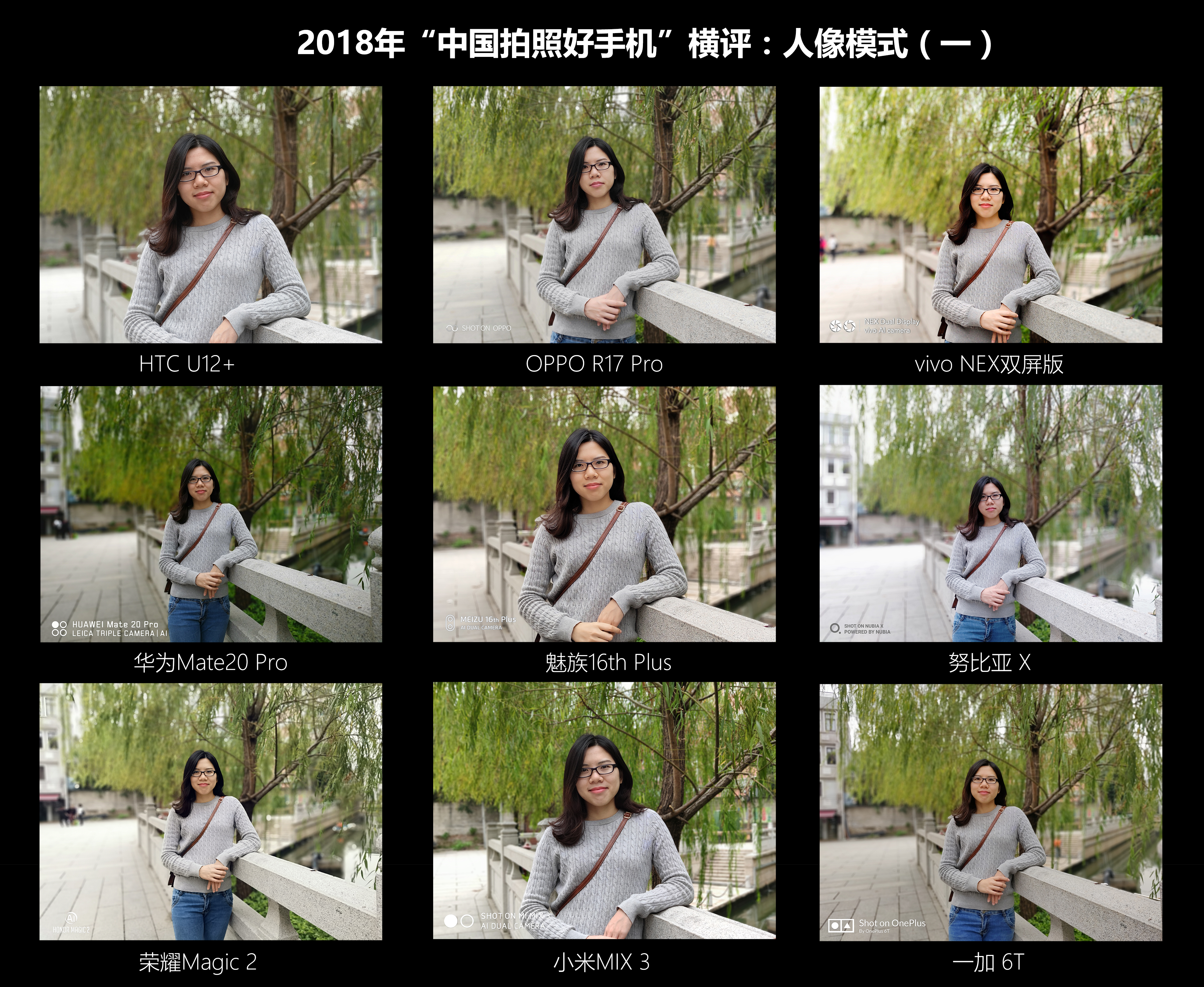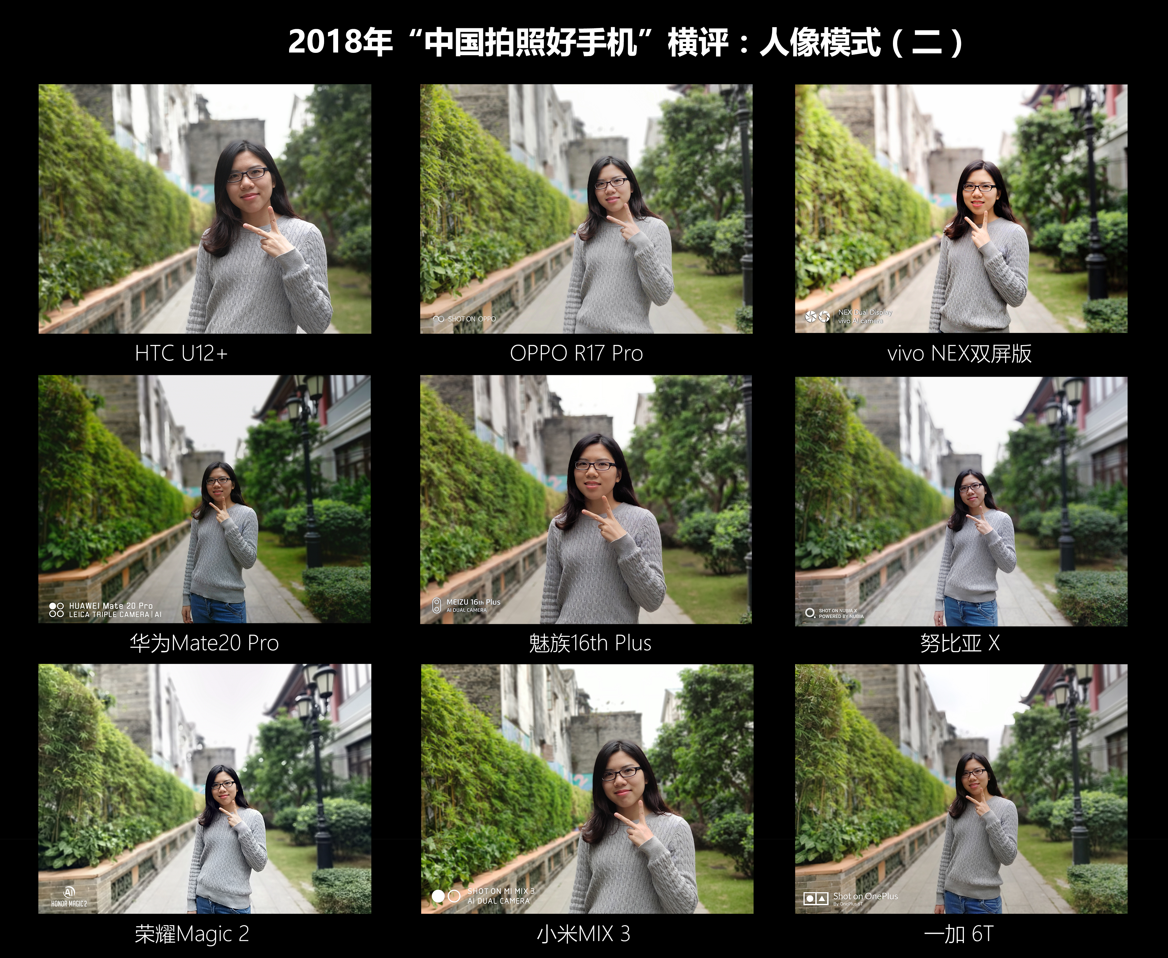 进入2018年之后,不少手机上的大光圈虚化模式变成了人像模式,人像模式是基于双摄大光圈虚化加上美颜效果,当然这个美颜的效果没有美颜模式下的强,但能也保证有较好的效果。参与测试的手机包括HTC U12+、OPPO R17 Pro、vivo NEX双屏版、华为Mate20 Pro、魅族16th Plus、努比亚 X、荣耀Magic 2、小米MIX 3、一加 6T,一共9台旗舰手机。