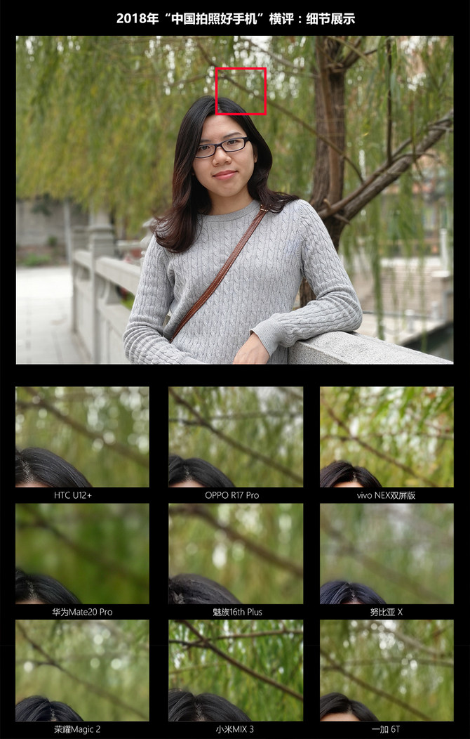 我们针对这个测试使用了一个十分苛刻的拍摄环境,人站在柳树前,柳树叶的虚化往往非常考验手机的算法,可以看到华为Mate20 Pro和荣耀Magic 2画面上的部分柳树叶出现了不能虚化的情况,而其他手机上并没有这样的情况。将图片放大后可以看到,HTC U12+、魅族16th Plus、荣耀Mgaic 2和一加 6T在背景虚化中出现了类似相机大光圈的光斑效果,带来更自然的虚化。放大后的图片可以看到努比亚 X的背景虚化显得很“生硬”,简单地将背景模糊,而小米MIX 3的背景虚化的“量”显得有些不足。