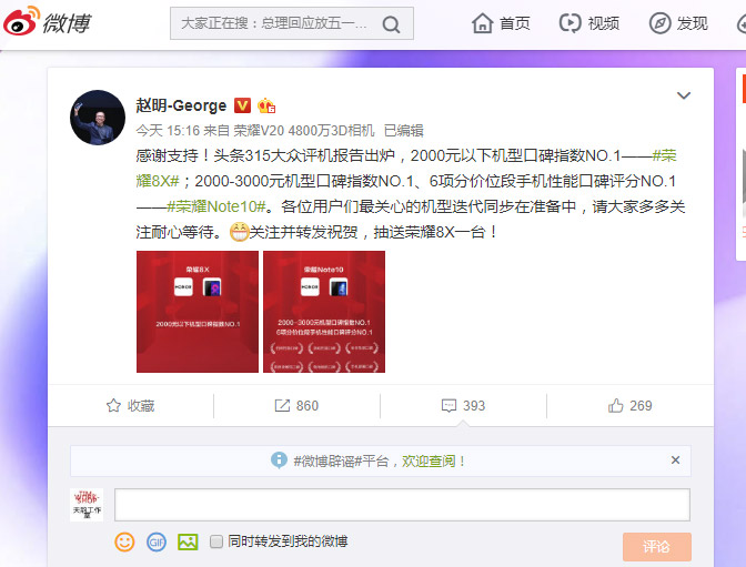 【IT168 资讯】今天是315消费者权益日,荣耀总裁在微博公布了荣耀8X荣获头条315大众评机2000元以下机型口碑指数NO.1,以及荣耀Note10荣获头条315大众评机2000-3000元机型口碑指数NO.1、6项分价位段手机性能口碑评分NO.1。