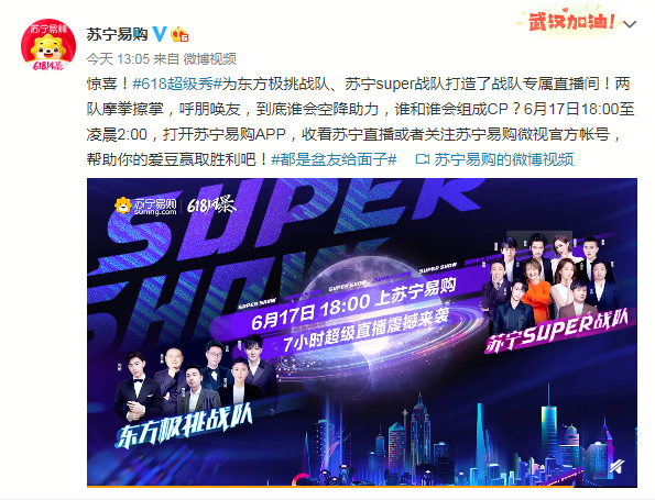 6月15日下午,苏宁易购官方微博宣布618超级秀将打造“超级买手直播间”,邀请众多明星艺人打造直播天团,为优先观众直播带货,预计时长超7个小时。