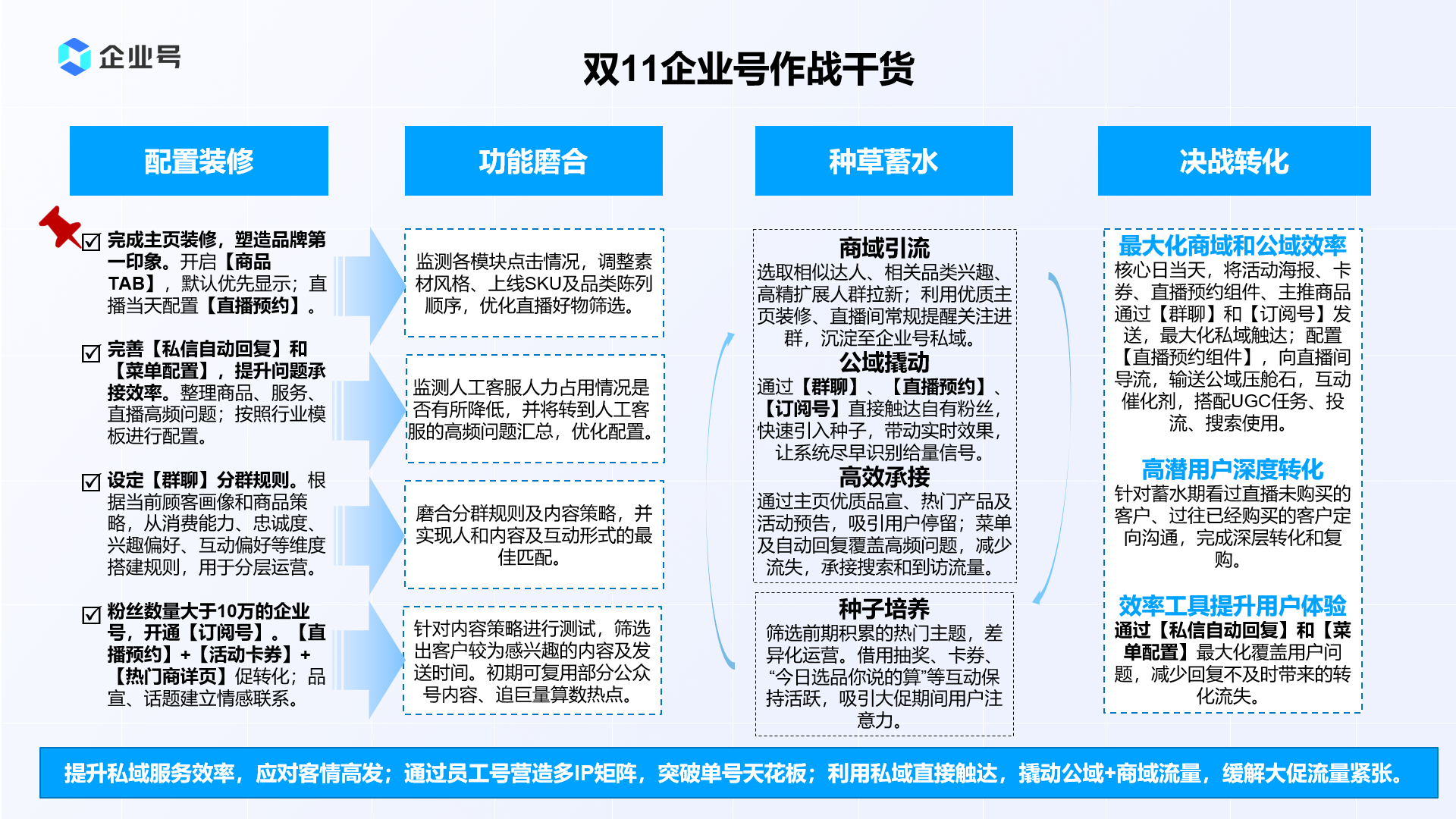 11.11种草蓄水期,企业主可以通过相似达人、相关品类、高精扩展、搜索模糊置顶等形式从商域进行引流;在企业号配置私信做好自动服务承接,通过主页展示商品或进行讲解;考虑到11.11期间竞争激烈,企业主需要在这一阶段通过群聊和订阅号内和自己的流量保持互动,引导看播,保持分享;在转化当天,全面开火,通过商域投流,订阅号、群聊、自动回复、主页装修等私域工具全面引入直播间,群内提升复购,进行转化。
