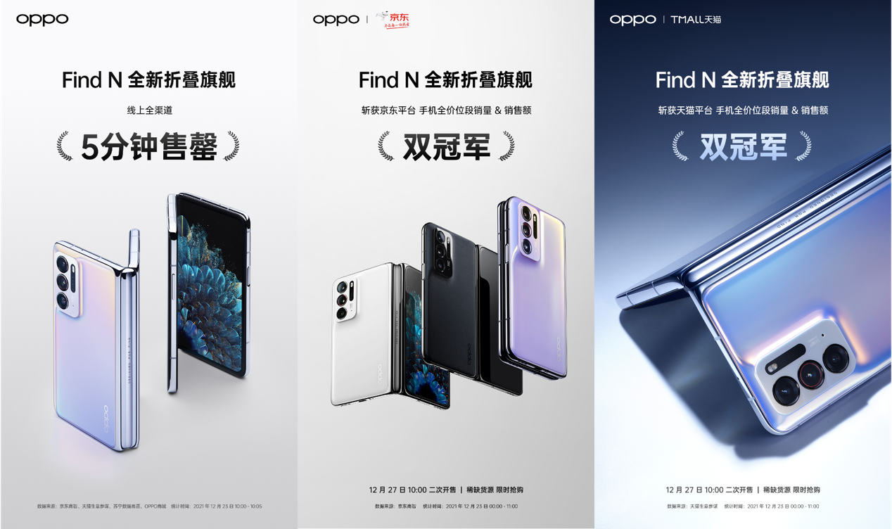 2021年12月23日,中国,深圳——年度折叠旗舰OPPO Find N于今日上午10点正式首销,开售5分钟线上全渠道售罄并斩获京东平台、天猫平台手机全价位段销量&销售额双冠军。