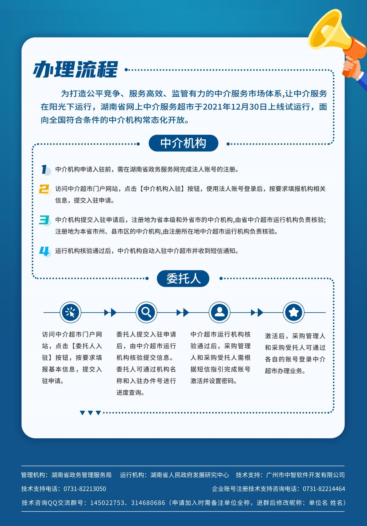湖南省网上中介服务超市是由省级统一建设,按照“一个平台、全省共用、分级实施”的原则进行运营、服务和监管,实行统一平台支撑、统一事项管理、统一入驻服务、统一网上交易、统一投诉处理、统一信用监管的中介服务网上交易的综合性信息化服务和监管平台。该超市由湖南省政务管理服务局统一牵头、湖南省人民政府发展研究中心建设运营、广州市中智软件开发有限公司开发和实施,通过网上中介服务超市,湖南省机关、事业单位、社会组织、企业等可成为“委托人”,在网上采购所需的工程设计、土地评估、建设项目环境影响评价等各类有偿中介服务。