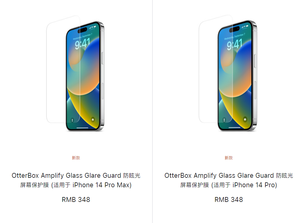 2.17日,苹果官网上架了2款手机屏幕保护膜,两款OtterBox Amplify Glass Glare Guard防眩光屏幕保护膜,适用于iPhone 14 Pro/Max适用,售价348元。