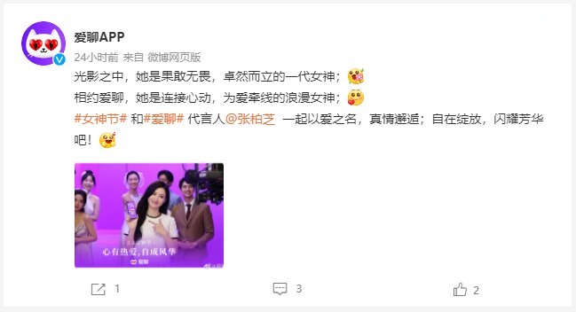 在充满春日气息的3月,女神节如约而来,在这个女性闪光的日子里,爱聊以品牌代言人女神张柏芝的工作照为引子,推出了超有创意的营销活动,为用户打造“爱聊女神墙”,以“做自己的闪光女神”为主题,让用户发现在日常生活中闪闪发光的自己或亲爱的她,为女性用户打造满满正能量的婚恋社交环境,更好地展现自己,遇见甜蜜爱情!