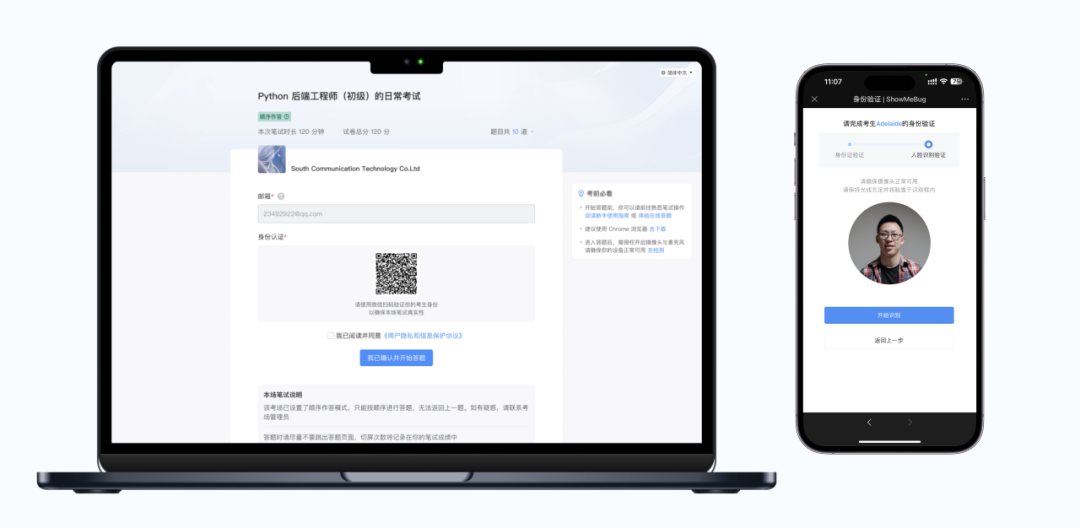 ShowMeBug 提供的解决方案正是确保真人出镜:首先,HR可以设置对候选人的身份进行相关信息的比对和验证,这样一来,候选人在答题前需要先做一轮身份验证,系统会对候选人上传的身份证,与笔试名字、人脸识别进行匹配,验证成功,方可开考。