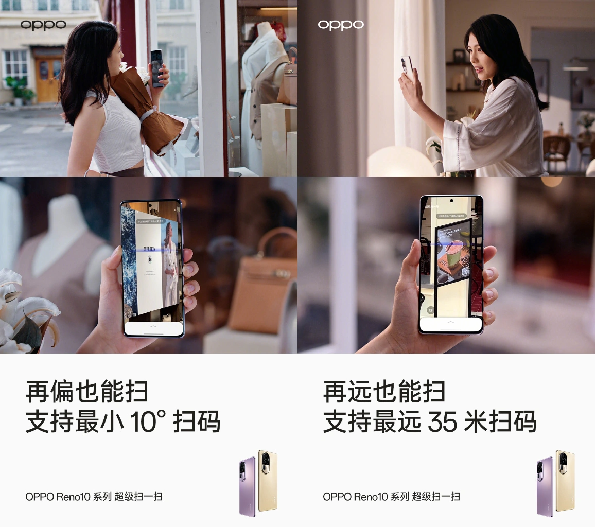 有意思的是,这次的Reno10 系列还带来了“超级扫一扫”这一行业领先的便捷扫码体验,这一功能有多方便?用户仅需双击电源键即可唤醒扫码,最远支持35米远的扫码,而最偏也能支持10度扫码,让用户的扫码体验变得更轻松、更便捷,以前要走多步到跟前才能扫码,现在只需走一步就能扫码了。