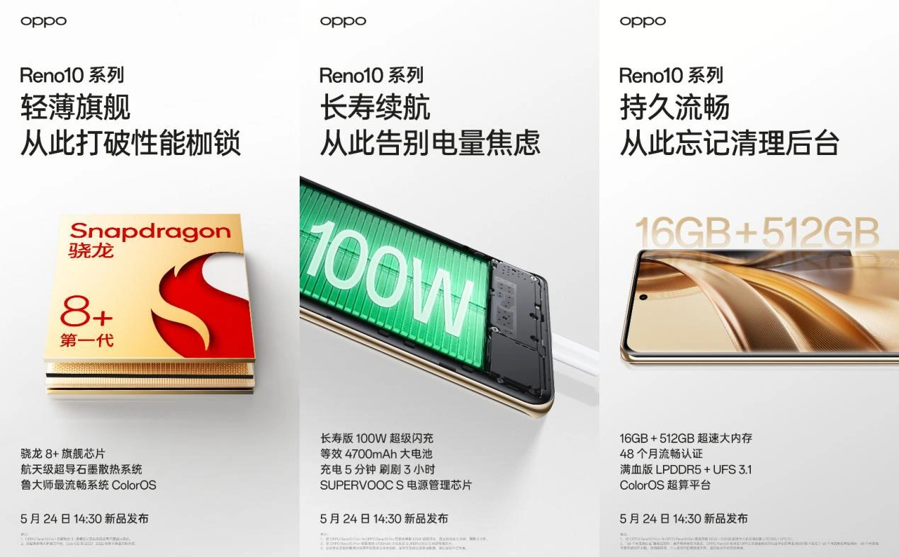 距离OPPO Reno10 系列发布仅有一天的时间,OPPO在今日继续带来劲爆预热,官宣了该系列的性能、续航及内存配置,确认了将搭载骁龙 8+ 旗舰芯片平台、长寿版 100W 超级闪充以及16GB + 512GB 超速大内存。