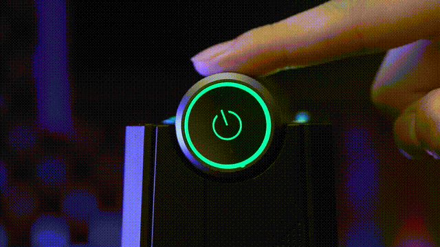 机身主体为纯黑色,从正面看,机箱从下往上做了金字塔形状的渐变,造型相当有特色。顶部配置了一个圆柱式的旋钮,按一下按键是开关机,通过转动旋钮,则可以在不同性能模式之间快速切换。