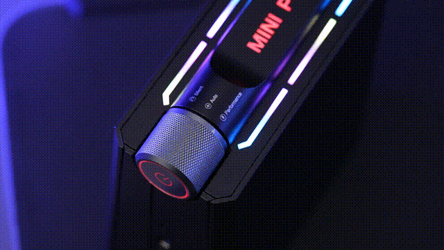 它一共有三种性能模式。其中蓝色静音模式,电脑维持在一个较低功耗的状态,大幅减少风扇噪音,保证办公的静谧性;绿色均衡模式,电脑自动调节性能和功耗状态,性能释放根据用户的工作强度自适应调节,平常开这个模式就够用了;性能模式,此时RGB灯光会转变为红色,电脑所有硬件将以最 高的性能状态运行,尤其适合运行复杂多任务工程,或者玩游戏。顶部中间和两侧都支持RGB光效,在不同的性能模式下,灯光的颜色会自动跟随切换。