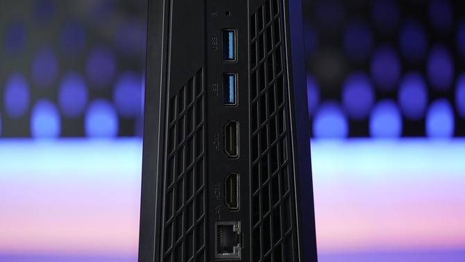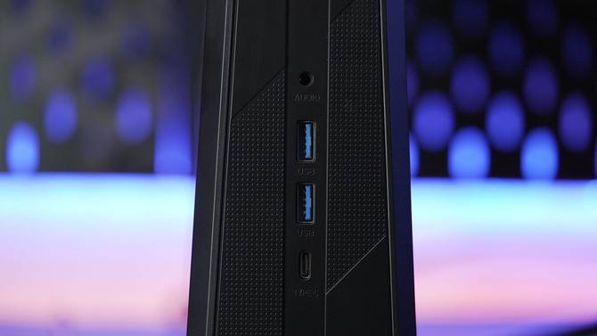 接口方面,正面配备2个USB 3.2高速接口,1个全功能Type-C口,还有一个3.5mm音频接口,方便平常传输数据或外接音箱或耳机。背面则是2个USB 3.2,2个HDMI 2.0,1个RJ45有线网口,以及一个DC电源接口。