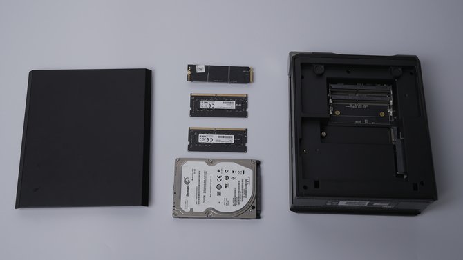 进入主机内部,MOSS小苔藓M9给玩家预留的升级空间也是很大的,双DDR4内存插槽,一个M.2 Nvme 2280固态硬盘位,还支持一个2.5英寸SATA硬盘位。