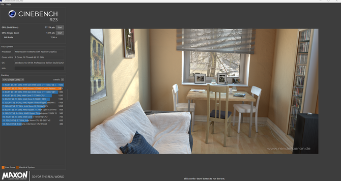 实测Cinebench R23 CPU渲染能力 ,多核得分11114分,单核1471分。