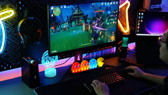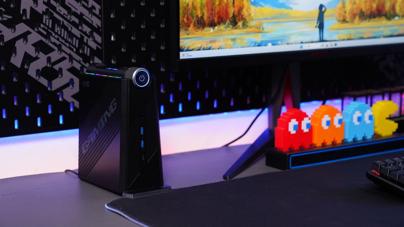 体积方面,AOC MOSS小苔藓M9的三维尺寸为154*78*186mm,差不多一本书的大小,摆在桌面上,甚至可以作为一个炫酷的RGB摆件。日常开机,插拔U盘/耳机之类的,再也不用蹲桌子底下找机箱了,使用起来特别方便。