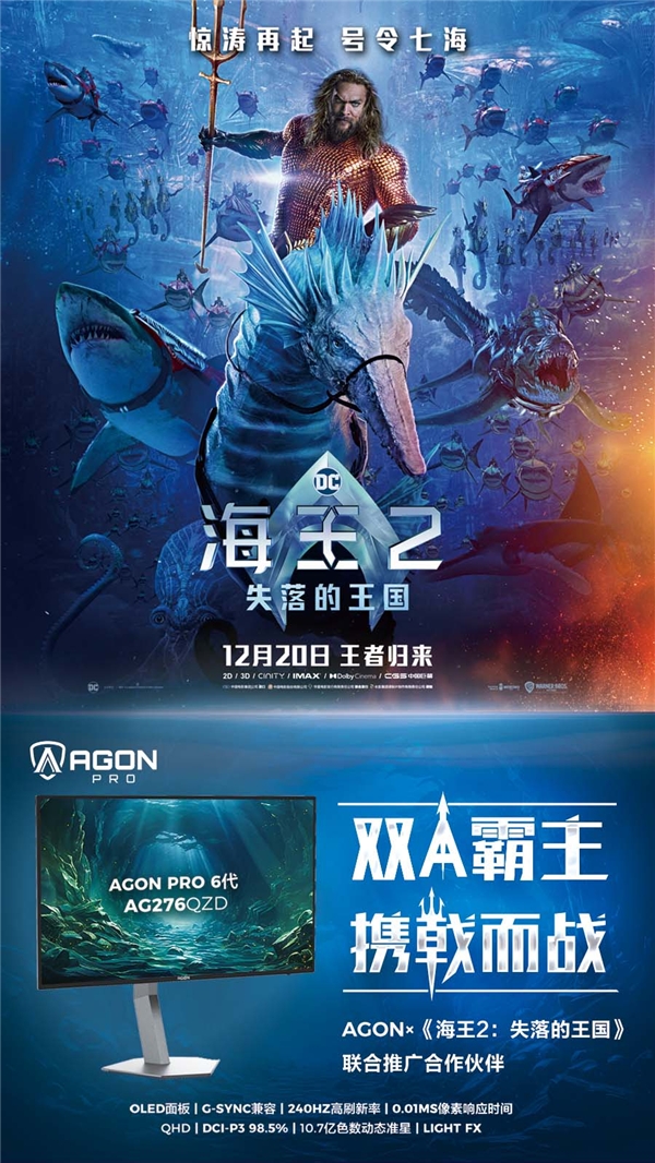 《海王》系列电影最早于2018年上映,是DC宇宙中首次完整演绎鼎鼎大名的超级英雄IP——海王亚瑟·库瑞的电影。第一部《海王》不仅取得了巨大的票房成功,也赢得了广大观众和评论家的赞誉,成为了DC超级英雄电影中的里程碑之作。同样在电竞领域,专业电竞品牌AGON爱攻,以创新和热爱为原动力,通过领先的显示技术、多元的创新合作,打造丰富的产品矩阵,在全方位覆盖电竞人群需求的同时,也不断巩固了自身在全球电竞显示器市场的领先地位,获得了全球玩家的广泛认可。
