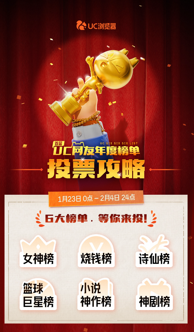 据悉,“UC网友年度榜单”将于2月5日正式揭榜,届时网友心目中的年度诗仙榜、年度烧钱榜、年度女神榜、年度篮球巨星榜、年度神剧榜等评选将逐一揭晓。