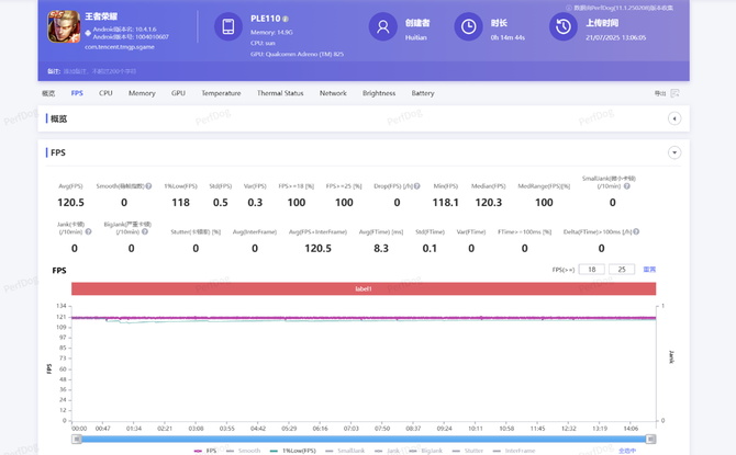首先是《王者荣耀》。开启高清120FPS,OPPO K13 Turbo Pro跑出了平均120.5帧、1%Low帧118帧的优异成绩,轻松征服轻压力的《王者荣耀》。