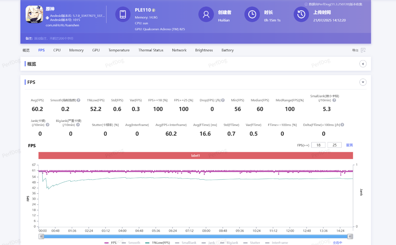 《原神》项目中,我们关闭动态模煳,其他画质选项最高,进行须弥城跑图测试。OPPO K13 Turbo Pro最终跑出了平均60.2帧、1%Low帧52.2帧的成绩,无惧开放世界挑战。