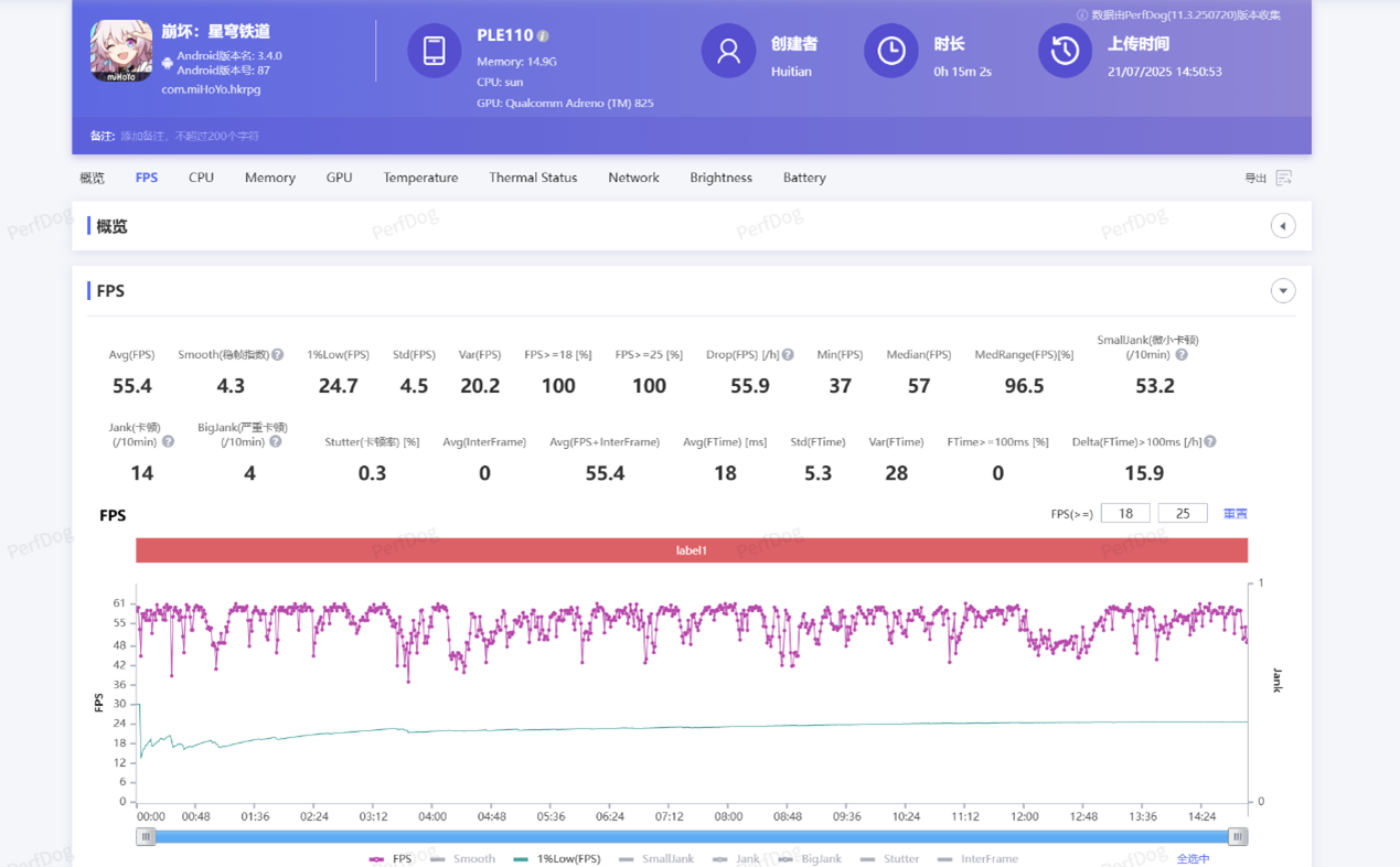 在压力最大的《崩坏:星穹铁道》中,画质最高,关闭动态模糊,在普通模式下进行匹诺康尼黄金的时刻跑图,OPPO K13 Turbo Pro最终交出了平均55.4帧的答卷,适当降低画质就能够实现畅玩。