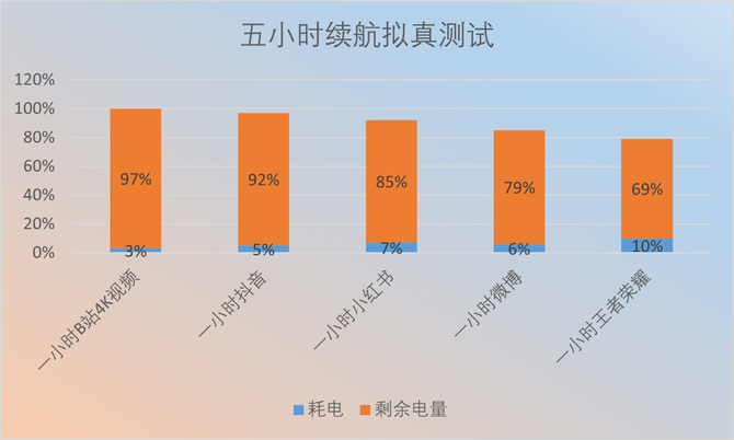 游戏表现优异,是否以难绷的功耗控制为代价呢?答案是否定的。OPPO K13 Turbo Pro搭载了一块7000mAh的超大冰川电池,并支持80W的超级闪充。我们在5G最高亮度的条件下进行续航模拟测试,分别进行一小时BiliBili 4K视频播放、一小时抖音、一小时小红书浏览、一小时微博浏览与一小时《王者荣耀》实测。