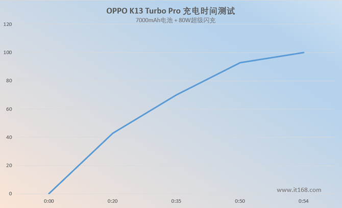 同时进行充电实测,从0%开始充电,完全充满这块7000mAh的超大电池仅需要54分钟,对于这么一个容量的电池来说相当不错了。