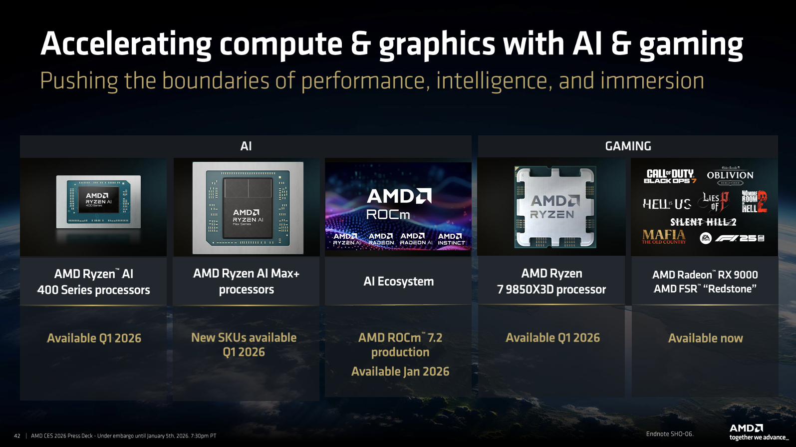 1 月 6 日消息,国际消费电子展CES 2026 上,AMD 携多款重磅新品亮相,包括锐龙 AI 400 系列、锐龙 AI Max + 系列新款处理器以及台式机专属的锐龙 7 9850X3D,同时推出 ROCm 7.2 软件平台,该系列处理器聚焦三大核心目标:实现 CPU、GPU、NPU 全维度领先性能,提供多日移动续航能力,持续提升 AI 性能以赋能下一代体验。据悉,新品将于 2026 年第 一季度陆续上市。