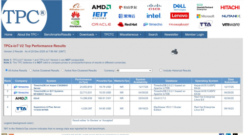日前,国际权威机构TPC公布TPCx-IoT物联网数据处理性能榜单,海光C86系列CPU与天谋科技TimechoDB时序数据库组合,在KeyarchOS操作系统上以2465万IoTps的超高事务处理速率夺冠,创下该领域世界纪录。