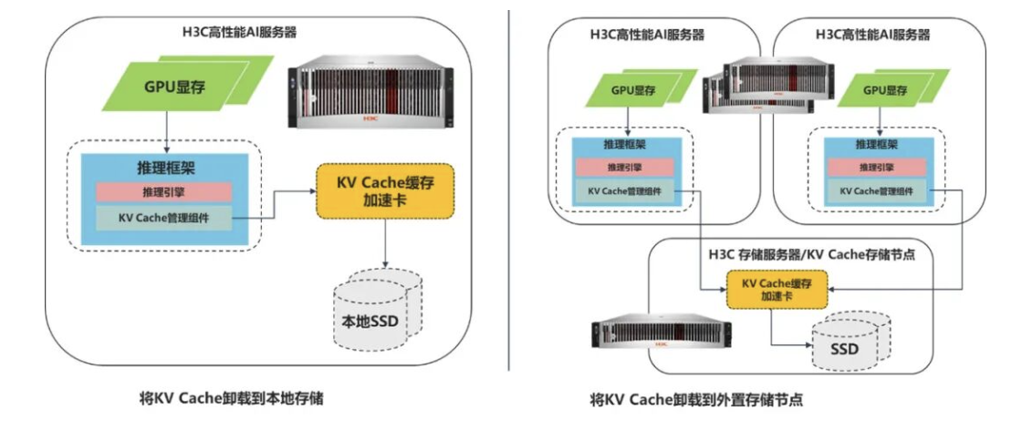 从部署形态来看,本方案既支持单机形态部署,直接提高单台AI服务器的推理性能。也支持通过外置存储节点的方式同时对接多台AI服务器,提高集群的推理性能。