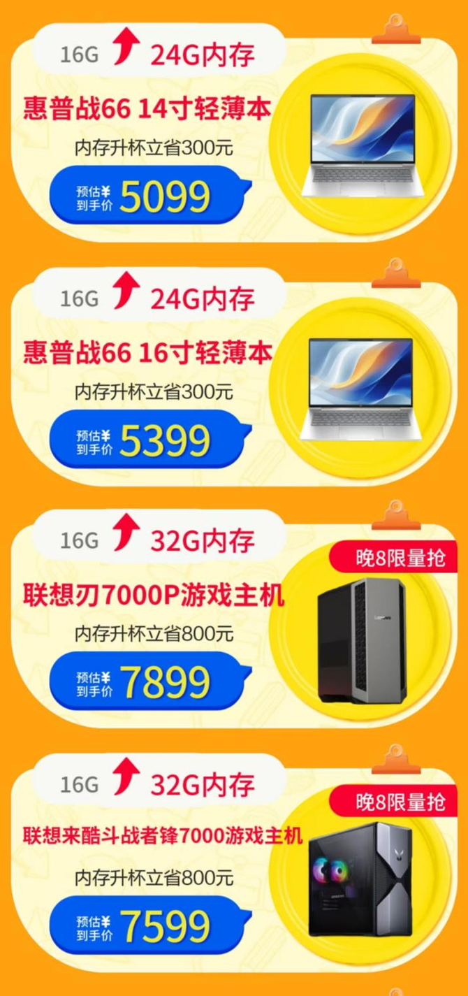 电脑品类同样福利满满,从办公轻薄本到游戏性能主机内存升杯一站式满足。惠普战66系列轻薄本是职场人办公的得力助手,14寸、16寸版本均升级至24G大内存,两款机型内存升杯均立省300元,预估到手价分别为5099元、5399元,大内存加持让多任务办公更流畅。联想刃7000P游戏主机16G内存升杯至32G内存,内存升杯立省800元,到手价7899元;联想来酷斗战者锋7000游戏主机32G版本同样升杯立省800元,到手价7599元,两款游戏主机均将于晚8限量抢购,深度游戏的性能党不容错过。