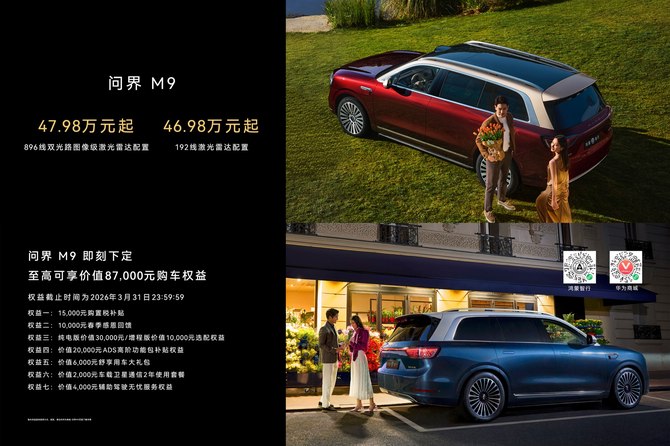 搭载全新一代激光雷达的问界M9,已于2026年3月4日开启预定,建议零售价47.98万元起,即刻下定,至高可享价值87,000元购车权益,权益截止时间为2026年3月31日23:59:59。