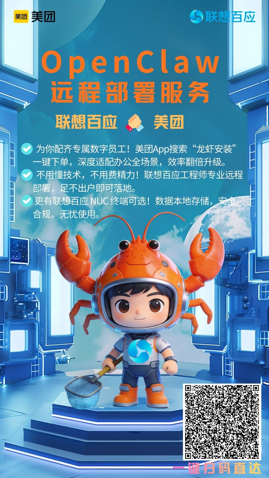 当开源 AI 智能体 OpenClaw 强势引爆市场,一场由智能体驱动的生产力革命正加速席卷而来。然而,环境搭建复杂、调试门槛居高、部署流程繁琐等行业痛点,却让众多渴望拥抱 AI 的用户望而却步。近日,联想百应率先与美团达成深度合作,重磅推出 OpenClaw 独家远程部署服务,以 “专业工程师代操作 + 全流程透明化” 的创新服务模式,让用户足不出户即可完成一键配置,彻底打破 AI 应用落地的技术壁垒,轻松解锁智能生产力。