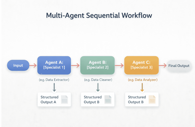 对于复杂的结构化任务,可以将工作分解并分配给一系列专用智能体。每个智能体都是处理特定子任务的专家,一个智能体的输出成为下一个智能体的输入,形成预定义的线性管道。