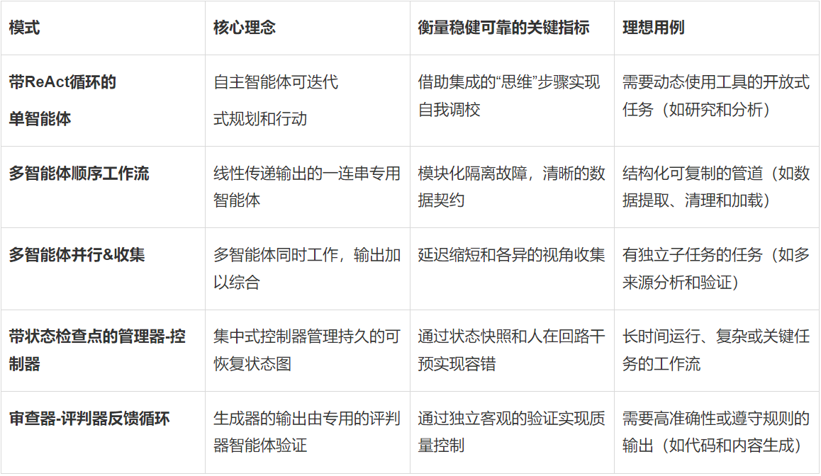 在本文中,你将学到应对这些根本挑战的五种基本设计模式。我们将以LangChain及其LangGraph扩展为参考框架,探讨能够为智能体应用程序提供结构、弹性和可观测性的模式。下表简述了这些模式及其主要优势。