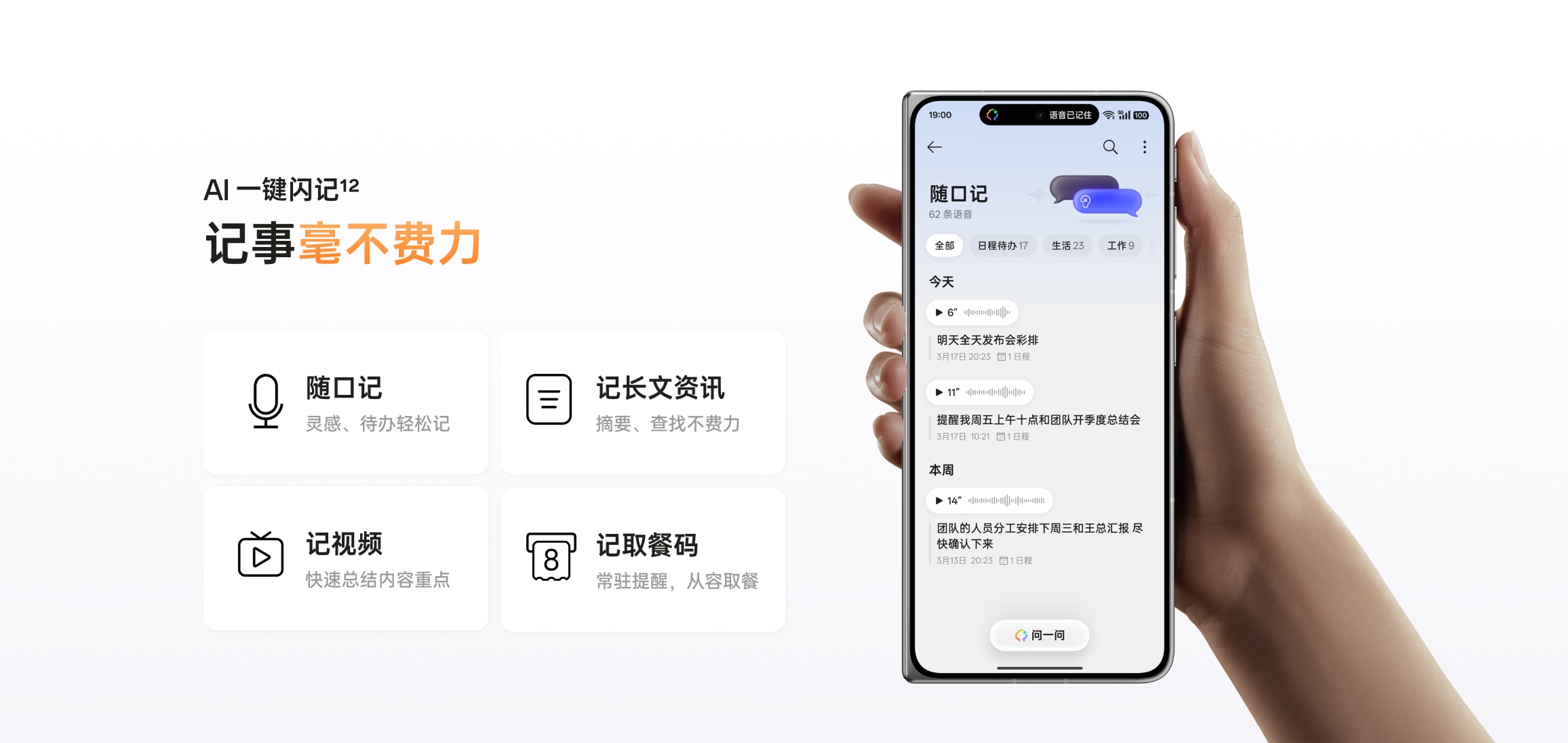 更具实用性的是,OPPO Find N6 还具备AI录音功能,可精准区分会议中的不同发言人,自动生成多模板智能会议纪要,真正实现“录音两小时,回顾五分钟”的高效办公体验,大幅减轻职场人士的会议记录负担。此外,闪记内容还可自动同步至小布记忆,支持全局搜索、语音问答,后续查阅、编辑、分享均能一键完成,形成“记录-整理-查阅”的完整闭环,让每一份灵感与信息都能高效留存、灵活调用。