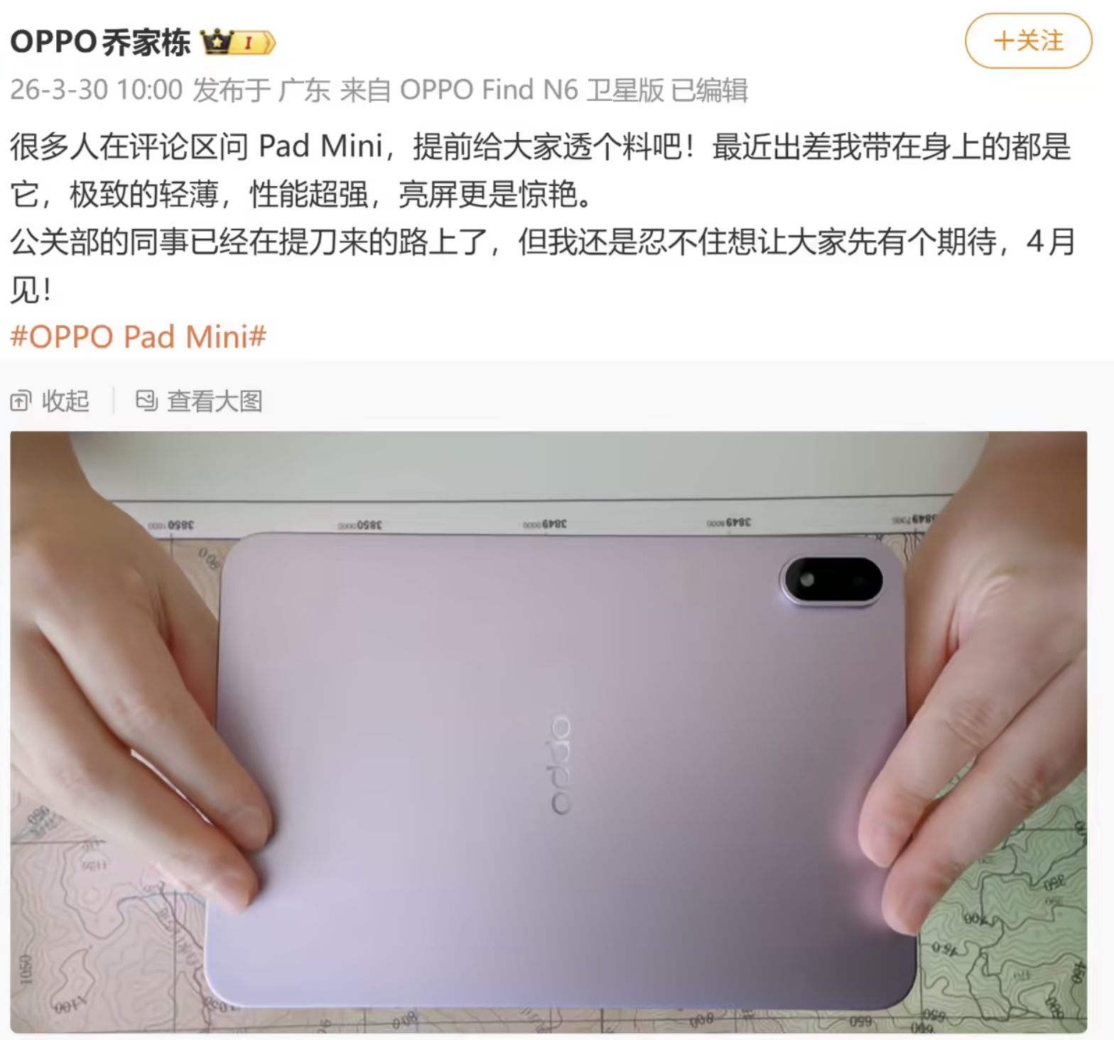 该产品定位类似华为 MatePad mini 的小尺寸平板市场,4月将正式发布。此外,OPPO 下个月还将带来 Watch X3 Mini 手表、Enco Clip 2 耳机、Find X9 Ultra 手机等多款新品。