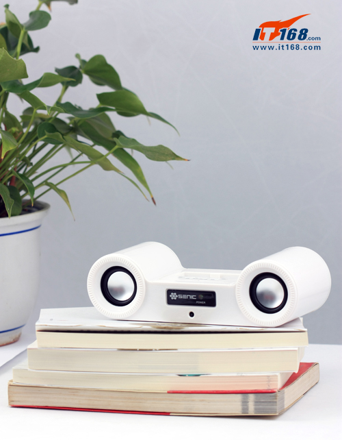 在音箱的背部则设计有USB接口、SD卡接口,电源接口、音频输入接口以及开关键。在两个圆柱体的背部则设计有倒相孔,使其在小体积音箱中能够拥有较好的低频效果。